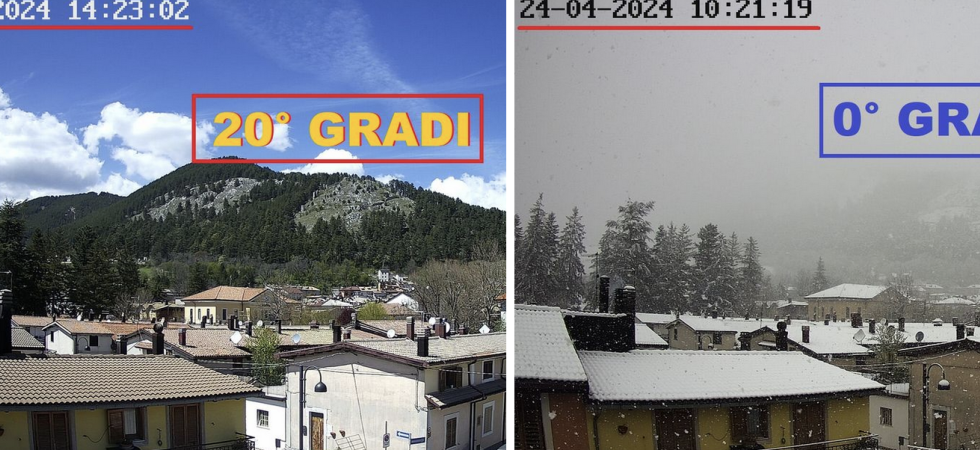 La pagina ha condiviso un confronto tra le situazioni immortalate dalla webcam e dalla stazione meteo di Pescasseroli, in provincia de L'Aquila, mercoledì 24 aprile "sotto una bellissima nevicata con 0° gradi" e oggi, 28 aprile, caratterizzato da temperature "intorno ai 20° C con un clima totalmente diverso".