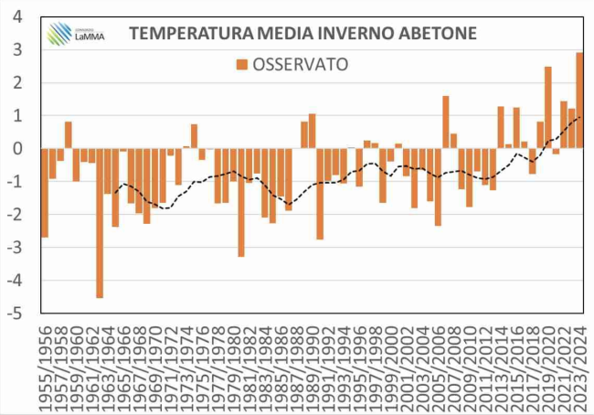 Il Lamma, Laboratorio di Monitoraggio e Modellistica Ambientale per lo sviluppo sostenibile della regione Toscana, ha certificato l’inverno del 2023-2024 il più caldo degli ultimi settant'anni per l’Abetone. In particolare, il trend positivo delle temperature medie è iniziato a risultare sempre più accentuato a partire dagli anni 2000, ma precedentemente le anomalie termiche erano minori e meno usuali rispetto agli ultimi anni. Le temperature del corrente “inverno” si attestano ben 3.3°C al di sopra delle medie stagionali del trentennio 1991-2020 e addirittura 3.7°C se considerate invece rispetto al periodo 1981-2010. Dati molto simili, e addirittura peggiori, sono stati condivisi dal Cetemps, Centro di Eccellenza dell’Università dell’Aquila in Telerilevamento e Modellistica previsionale di eventi severi. Infatti, la temperatura del secondo mese del nuovo anno si è attestata ad un +4°C rispetto alle medie di riferimento sul periodo 1991-2020.