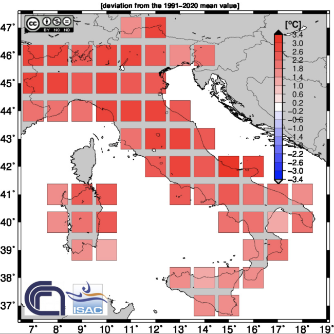 Anche considerando la sola penisola italiana l’ultimo febbraio è stato il più caldo della storia, come confermano i dati dell’ISAC-CNR. Guardando alle elaborazioni grafiche dell’istituto, scopriamo che i numeri, in questo caso, sono ancora più spaventosi: la temperatura media di Febbraio, in Italia, è stata di 3.09°C superiore al periodo di riferimento 1991-2020 (e, notate, qui stiamo parlando di un periodo di riferimento molto più vicino rispetto all’era pre-industriale). Così come quello globale, forse anche questo dato non desterà grande stupore, visto che lo scorso mese ci hanno fatti sentire in piena primavera più che in pieno inverno.