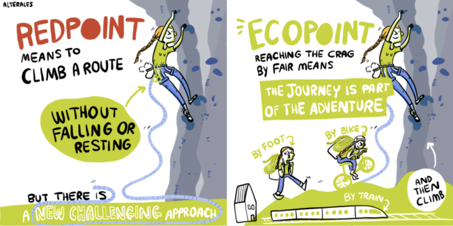 Nel mondo dell'arrampicata infatti si parla di "red point" quando si scala in libera una via da terra alla cima in arrampicata, dopo averla praticata o dopo aver fallito il primo tentativo (cadendo o appoggiandosi alla corda per l'aiuto artificiale). Il concetto di "eco point" rappresenta uno step ulteriore, e si estende includendo anche l'avvicinamento by fair means (ovvero tramite trasporto pubblico, bicicletta, barca, piedi).