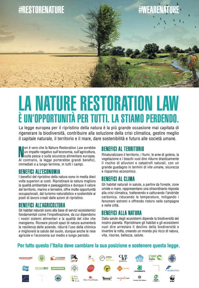 La legge sul Ripristino della natura, in realtà porterebbe benefici straordinari, oltre che alla biodiversità e alla lotta ai cambiamenti climatici, proprio ai territori, all’agricoltura, alla pesca e all’economia tutta, smentendo la narrazione anti-ambientale di alcuni gruppi politici e organizzazioni agricole.