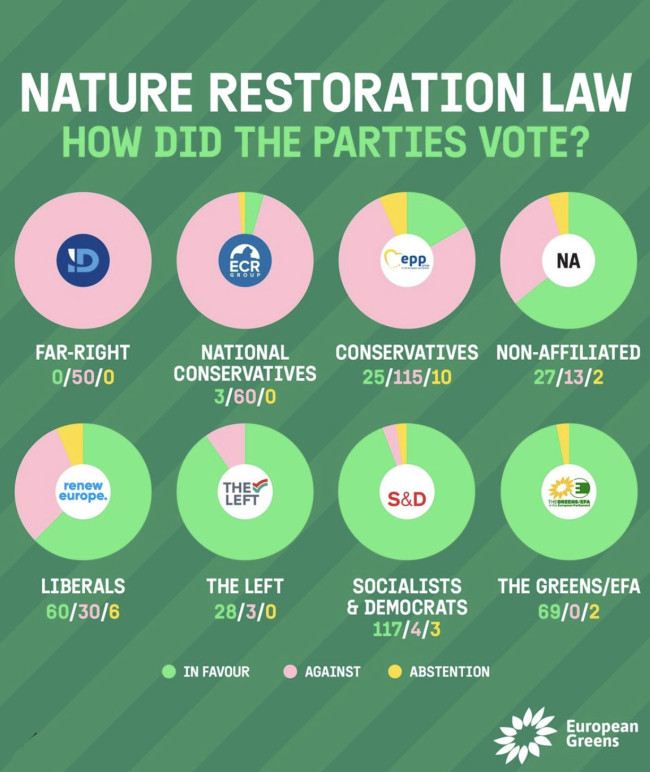 La prima bozza della legge viene approvata lo scorso luglio. Da allora è partita la “caccia all’emendamento” in vista del voto di mercoledì scorso, rinforzata anche dalle recenti proteste del mondo agricolo che hanno portato ad una polarizzazione sempre più estrema della questione ed esacerbata ulteriormente dalla campagna elettorale in vista delle prossime elezioni europee. Il testo definitivo approvato è stato definito un “annacquamento” della proposta originaria, perché introduce diverse eccezioni sugli obiettivi proposti, rende volontarie alcune misure che prima erano vincolanti e stabilisce un cosiddetto “freno d’emergenza”, per sospenderne l’applicazione in circostanze eccezionali che possano minacciare la produttività agricola. Una maggiore flessibilità introdotta per cercare di accomodare i partiti contrari. Che però, come mostra eloquentemente l'infografica di come si è votato, sono andati avanti per la loro strada.