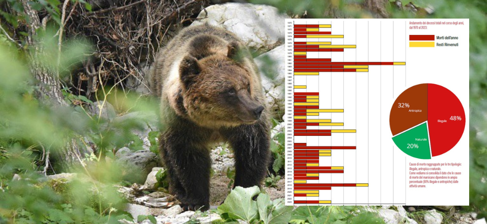 Nel periodo 2003-2024 sono stati rinvenuti morti un totale di 52 esemplari di orso marsicano, per una media di 2,4 orsi/anno, con un minimo di zero ed un massimo di 6 in un singolo anno solare. Di questi, il 50% di quelli per cui è stato possibile accertare le cause di morte è risultato deceduto a causa di uccisione illegale da parte dell’uomo (arma da fuoco, avvelenamento, etc.), mentre un ulteriore 30% per altre cause comunque legate all’attività antropica (incidente stradale o ferroviario, annegamento, etc.).