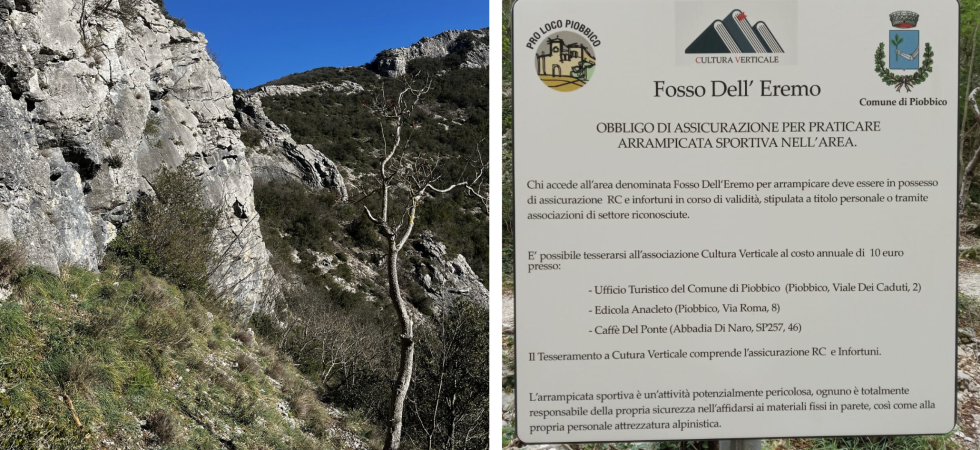 “Obbligo dell’assicurazione per praticare l’arrampicata sportiva” fa discutere il cartello della falesia del Fosso dell’Eremo