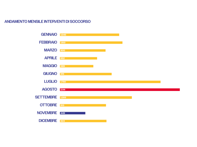 Continuando a connettere i numeri e le percentuali del rapporto con il turismo (e in particolare con il turismo di massa), tornano utili altri due dati. Il primo è quello relativo all'andamento mensile degli interventi, che seguono molto chiaramente l'alta e la bassa stagione turistica, con il massimo raggiunto ad agosto (più di 2100 interventi) e il minimo osservato in novembre (solo 449).