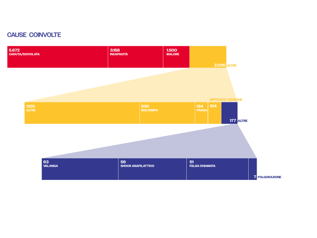 Il secondo è quello relativo alle cause che hanno portato alla richiesta di soccorso. Infatti, delle 12.349 missioni di soccorso dell'anno, ben 4.151 delle persone soccorse sono state classificate come "illese", ovvero "persone in difficoltà a causa delle condizioni morfologiche, dello stato dei terreni come la presenza di neve e/o ghiaccio al suolo, oppure per incapacità e/o inadeguatezza dell’attrezzatura, calzature o abbigliamento a seguito".