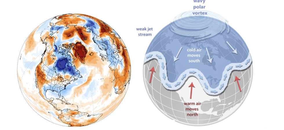 Essenzialmente, l'indebolimento dei gradienti di temperatura che generano le correnti a getto fa si che queste diventino meno forti e soprattutto che si "sbrodolino", seguendo delle traiettorie che sono caratterizzate da grandi anse che consentono ad alcune masse di aria fredda, polare, di scendere verso sud.
