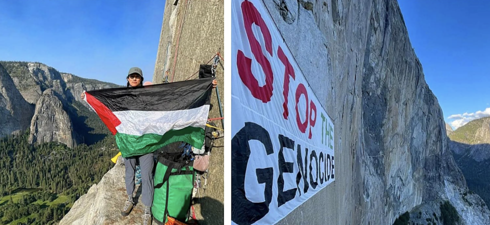 Quattro arrampicatori professionisti, membri del collettivo "Climbers with Palestine", hanno messo in atto una protesta contro l'invasione israeliana nella striscia di Gaza appendendo uno striscione con le parole "Stop al genocidio" e i colori della bandiera palestinese sull'iconica parete di El Capitan. Emily Meg Weinstein: "Come ebrea, farlo con i miei cari amici palestinesi e americani non solo mi sembra giusto, ma anche molto importante in questo momento"