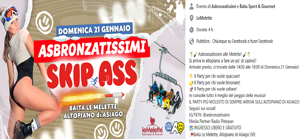 Un messaggio promozionale di pessimo gusto che recita Skip Ass con tanto di immagine sessista in bella mostra lancia un evento su quell'Altopiano di Asiago che fu casa di Rigoni Stern che nel 2006, a Repubblica diceva: ''Ci sono quelli che amano la montagna per sé stessa, altri che la vedono come un luna park''
