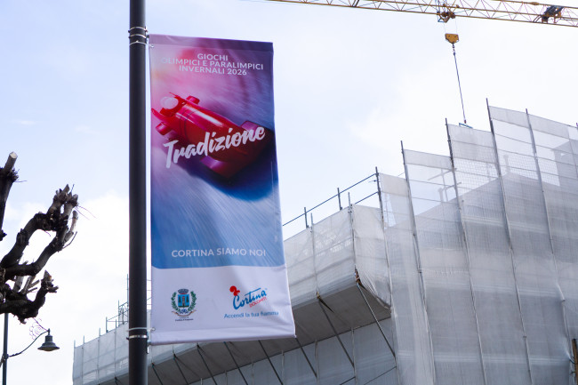 Di fronte a loro si alzano i bastioni rocciosi delle Tofane; dietro si stendono pendii brulli dai quali emergono, per contrasto, strisce di un bianco intenso, ma innaturale: piste di neve programmata e, a ridosso di Cortina, il budello della nuova pista da bob, accuratamente imballato. Un’immagine che ricorda involontariamente l’opera di Christo.