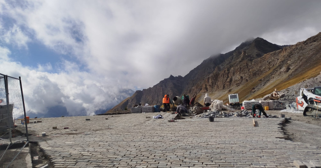 Il cantiere, concentrato sul versante francese del passo, ha imposto una chiusura provvisoria al traffico del valico (tra il 6 e l’8 ottobre) per consentirne la conclusione. Nelle fotografie pubblicate dal Comune, si vedono gli operai impegnati nella posa della pavimentazione del porfido e di nuove panchine di legno.