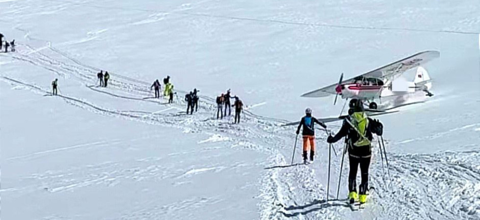 L'aereo da turismo si vede arrivare sul ghiacciaio. Vira a sinistra e gli scialpinisti lo seguono con lo sguardo fino a quando riparte con la sua corsa a tutta velocità passando in mezzo alla cordata, per poi decollare e allontanarsi. Una manovra che ha creato momenti di paura per i presenti