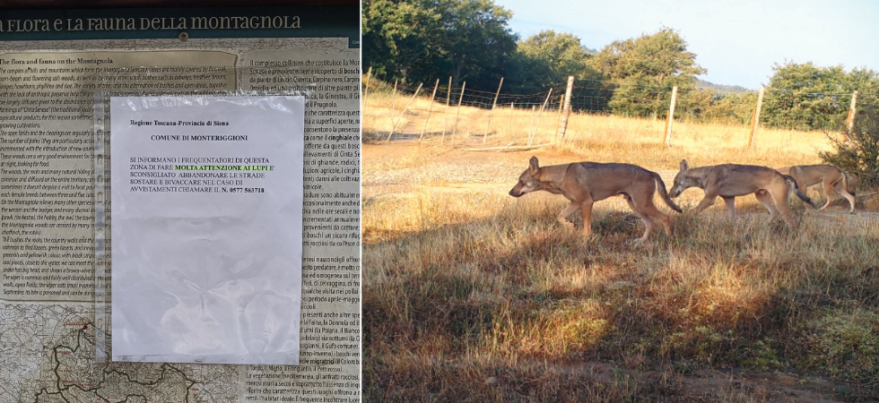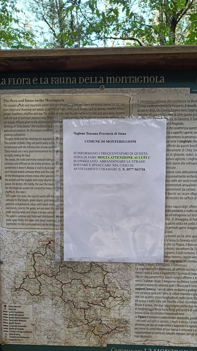 "Si informano i frequentatori di questa zona di fare molta attenzione ai lupi. È sconsigliato abbandonare le strade, sostare e bivaccare. Nel caso di avvistamenti chiamare il n. 0577 563718".