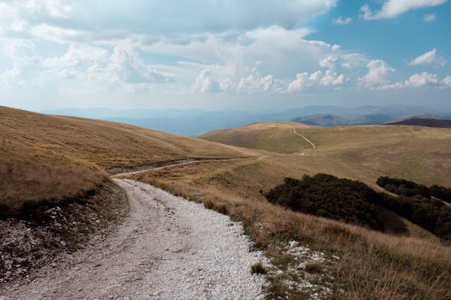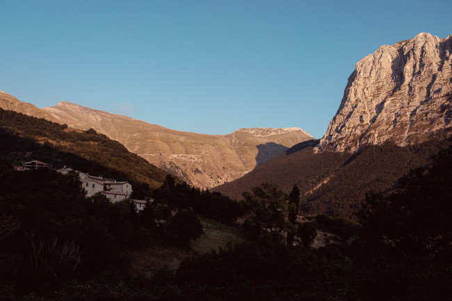 Lasciando il fondo valle i rumori dei cantieri si allontanano, ma non faccio in tempo a saziarmi di quella tranquillità che il paesaggio intorno a me si trasforma all’improvviso: i prati perdono la loro brillantezza facendosi di un grigio scuro. Sopra di me una grande nuvola comincia a borbottare, e dopo pochi minuti i tuoni minacciano un temporale. La pianura di fianco al crinale della montagna è già bagnata dalla pioggia e non devo perdere tempo, così raggiungo il primo colle e mi getto lungo un sentiero sconnesso sul versante opposto. Arrivato in un paese di nome Montefortino le nuvole sono più rade, eppure non mi sento tranquillo.