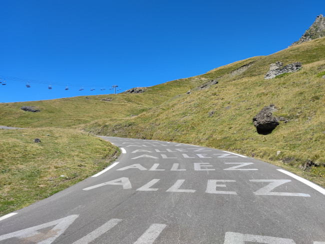 Arrivi a La Mongie, un posto orribile di grattacieli che graffiano le montagne, costruiti per sciatori ricconi stile "Vacanze di Natale", e ti sale tutta la rabbia sociale e la sete di riscatto che diedero vita alle prima gare ciclistiche. Questo moto proletario e ambientalista ti aiuta ad affrontare gli ultimi quattro, interminabili chilometri, scanditi dalle scritte sull'asfalto dei tifosi del Tour, che leggi tutte, dalla prima all'ultima, le reciti anzi, come una litania.