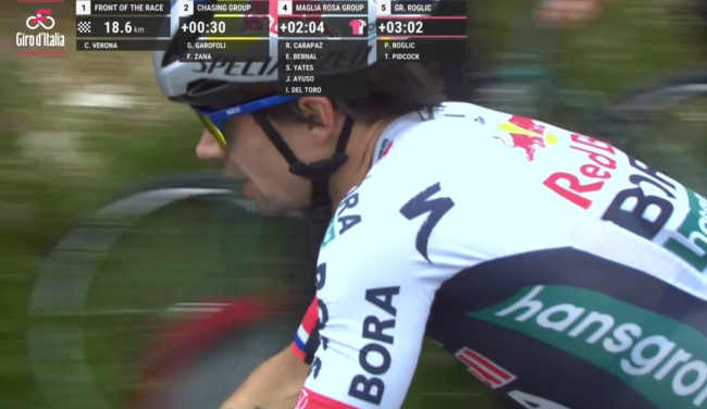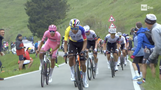 Egan Bernal è stato anche oggi il primo a provarci: sia sul Monte Grappa, quando la sua azione ha provocato l'esaurimento della prima fuga di giornata; sia sulla successiva salita di Dori, quando il suo movimento ha innescato una girandola di attacchi che non ha condannato al fallimento anche la seconda fuga di giornata (quella con Carlos Verona) ma, più significativamente, ha rivelato la sofferenza di Primoz Roglič, che saliva con la bocca aperta e la pedalata sghemba.