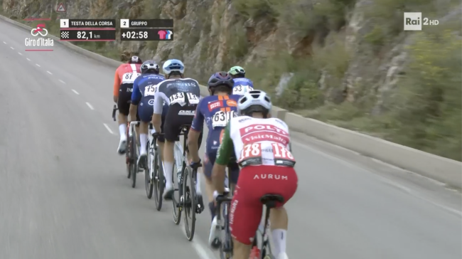 Jacopo Mosca della Lidl-Trek e Gianni Moscon della RedBull Bora erano ambasciatori di due squadre diverse, portatori di obiettivi differenti ma complementari: desideravano entrambi che la fuga non prendesse il largo. Mosca lo faceva per favorire la vittoria di tappa del suo capitano Pedersen; Moscon lo faceva per "onorare la maglia rosa" indossata dal suo capitano Roglič, ma in realtà neppure a lui dispiaceva troppo la prospettiva di una vittoria di Pedersen. Insieme alla maglia rosa, Roglič avrebbe così ceduto a Pedersen gli oneri ad essa associati, incombenze che il campione sloveno è felice di assumersi più avanti nel corso del Giro.