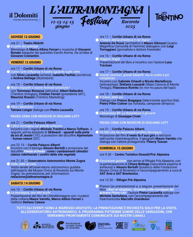 Il Festival de L'AltraMontagna va alla scoperta del Monte Baldo tra Avio e Brentonico e in particolare della zona della Pra' Alpesina, un'escursione a partecipazione gratuita accompagnata da Alessio Bertolli, vice direttore e botanico della Fondazione Museo Civico di Rovereto, e da Chiara Bettega, naturalista esperta di avifauna del Muse (Qui info). Un'iniziativa che vede tra i partner anche Wikiloc, piattaforma specializzata nell'outdoor che conta oltre 17 milioni di persone, ha condiviso più di 60 milioni di percorsi all’aria aperta e oltre 110 milioni di foto.