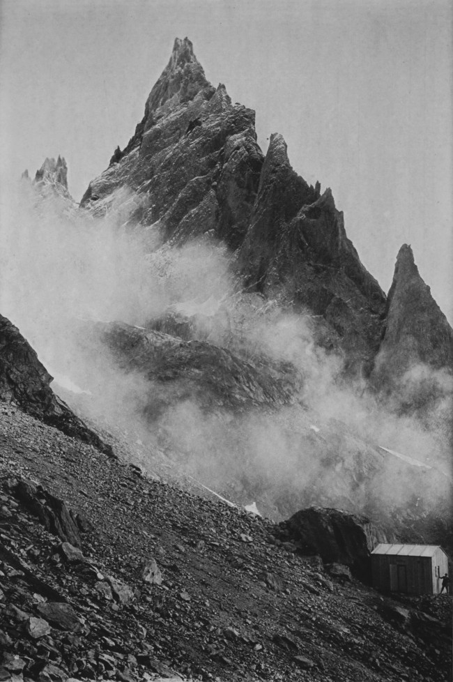 Intorno a mezzogiorno si trovano già alti sulla parete. Sanno di avere davanti a loro almeno sette ore di luce, possono permettersi una breve sosta e mangiare qualche cosa seduti su un terrazzino. Il vuoto sotto di loro è pauroso, il rifugio un puntino appena visibile oltre il ghiacciaio. Ed è in quel momento che, guardandosi intorno, notano dei nuvoloni addensarsi intorno alla cima del Bianco.