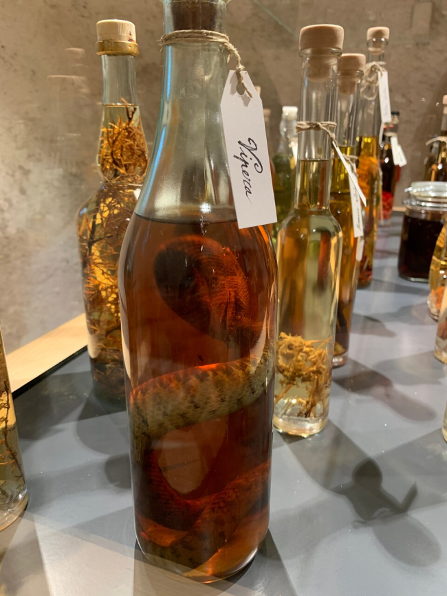 È la grappa alla vipera, nascosta sulle mensole tra le bottiglie di genziana, mugo o altre erbe. La ricetta pare esigesse una grappa di alta qualità, un pizzico di peperoncino e un esemplare di vipera aspis ben disposto, anche perché alcune formule vogliono che la serpe sia immersa ancora viva. L’alcol dovrebbe neutralizzare le tossine dannose del veleno, dimodoché l’elisir, che qualcuno dice afrodisiaco, altri farmaceutico e altri ancora semplicemente apprezzabile nel sapore (tutte opinioni che non ci risultano dimostrate), possa rilasciare i suoi effetti benefici.
