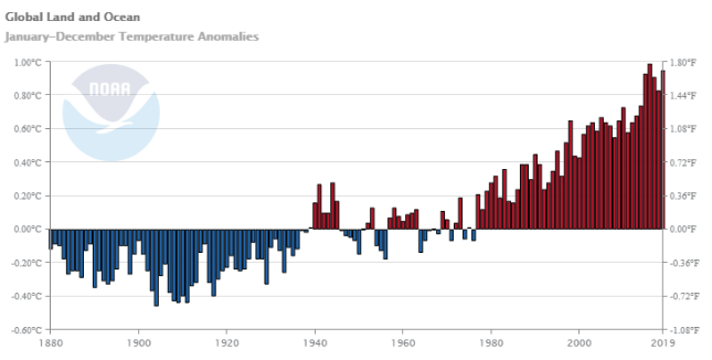 Prendendo come base di riferimento il periodo 1901-2000, il 2019 ha registrato un’anomalia di temperatura di +0,95 gradi, il più caldo fu il 2016 con un’anomalia di +0,99 gradi e il più freddo il 1904 con un’anomalia di -0,46 gradi (dati della NOAA – National Oceanic and Atmosperic Administration degli USA).