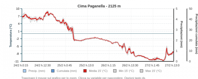 Ieri una saccatura è transitata sulla nostra Provincia, portando con sé aria fredda (articolo QUI). Il calo termico è stato notevole, e la stazione di Meteotrentino in Paganella (vedi figura sotto) è passata da una massima di +9,3 gradi del 24 febbraio ad una massima di oggi di -4,8 gradi (quindi un calo di 15 gradi) e si è passati da una minima di +4,7 gradi del 24/02 ad una minima di oggi di -10,9 gradi da confrontarsi con la minima del 24/02 di +4,7 (diminuzione quindi di 15,6 gradi)”.