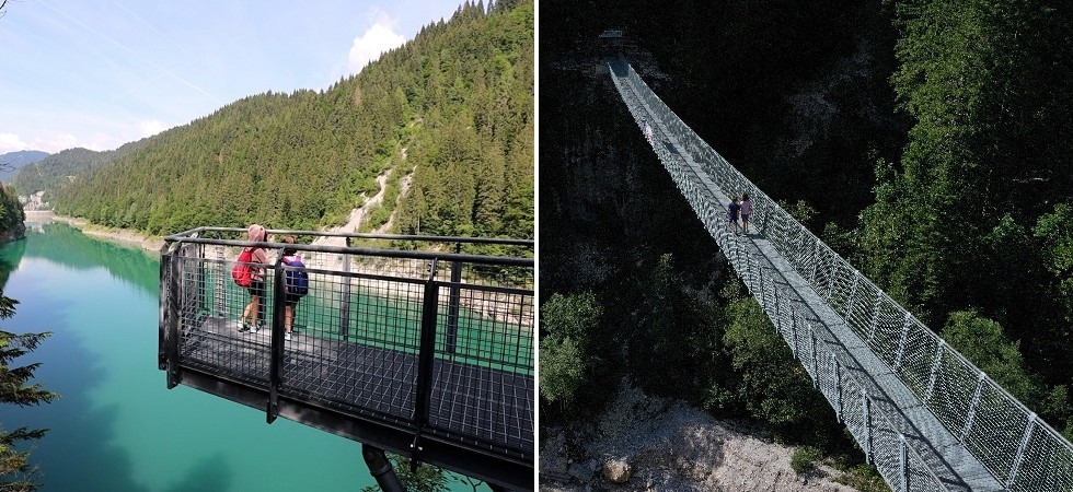 Delle due strutture (entrambe realizzate in materiale zincato), quella più in basso permetterà agli escursionisti di godere di una meravigliosa vista sul lago artificiale della Val Noana, e servirà a dare continuità al sentiero che collegherà località Col con il ponte su funi sul rio Giasinozza. L'idea è quella di formare un giro ad anello fra rivi, lago e boschi con punti panoramici e, allo stesso tempo, potenziare la rete sentieristica della zona.