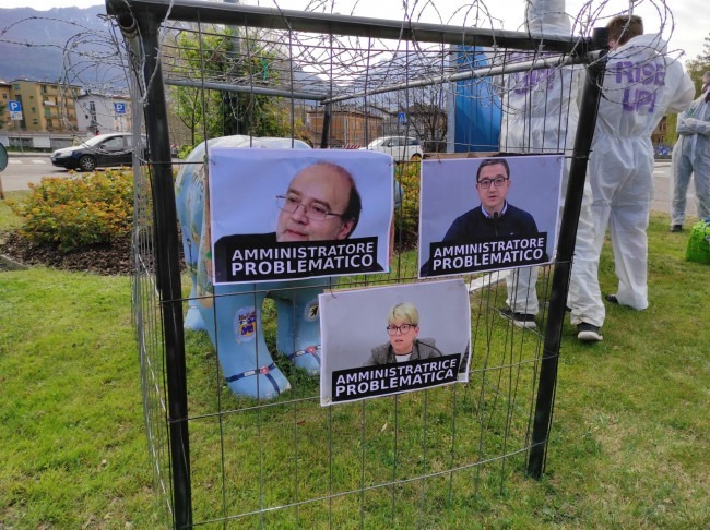 La statua è stata poi circondata da cartelli che inneggiavano alla liberazione degli orsi e contro alcuni politici locali. “A distanza di un mese e mezzo dalla pubblicazione del video shock – ha dichiarato un’attivista del Centro sociale Bruno – con cui abbiamo svelato le drammatiche condizioni dei tre orsi prigionieri richiusi al Casteller di Trento, siamo nuovamente scesi in piazza a denunciare la totale inadeguatezza delle istituzioni provinciali rispetto alla cosiddetta ‘gestione dei grandi carnivori’ e a richiedere il rilascio degli orsi prigionieri”.