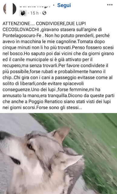Ecco che, allora, quanto accaduto a Ferrara (un'azione prettamente predatoria di rincorsa di un ciclista da parte di ben due esemplari con tanto di morso alla scarpa del malcapitato ciclista) avrebbe avuto del clamoroso. Immediatamente dopo la segnalazione l'amministrazione comunale di Ferrara è intervenuta ed ha individuato due cani da lupo cecoslovacco. Due esemplari, un maschio e una femmina, sprovvisti di microchip. I due cani (in quanto tali ovviamente confidenti con gli esseri umani e facili ad inseguire ciclisti e corridori) sono stati ''recuperati dal personale del canile Municipale Terre del Branco'' come spiegato dall'Enpa Ferrara sulla propria pagina Facebook. Alle operazioni hanno partecipato il servizio veterinario di Ausl Ferrara e le guardie zoofile di Enpa.