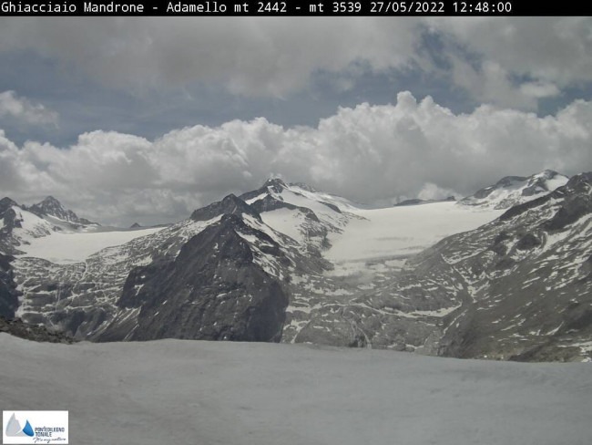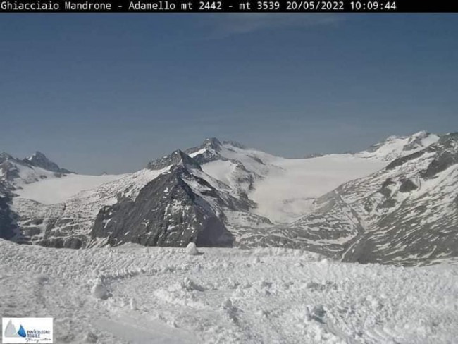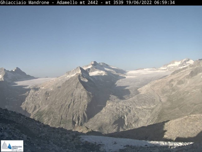 Il primo riguarda il ghiacciaio del Mandrone (Adamello) ritratto il 20 maggio 2022 e il 19 giugno 2022. Dunque in un mese esatto (sotto l'evoluzione come da webcam), praticamente, è scomparsa tutta la copertura nevosa e il ghiacciaio si presenta come si presenterebbe ad agosto.
