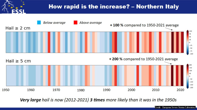 Un recente studio, coordinato dall’European Severe Storms Laboratory e firmato, fra gli altri, dal meteorologo Francesco Battaglioli ha messo in relazione le grandinate con i cambiamenti climatici, confermando l’incremento dei fenomeni più violenti. Nel Nord Italia per esempio, rispetto agli anni ‘50, le grandinate con chicchi più grandi di 5 centimetri di diametro sono triplicate. Discorso simile per quanto riguarda le grandinate di dimensioni inferiori che fra il 2012 e il 2021 sono state due volte più frequenti se raffrontate con quanto accadeva a metà del Novecento.
