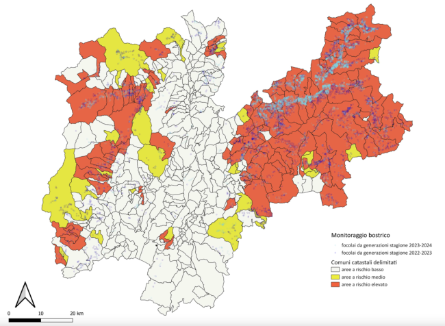 Il rischio rimane elevato in 107 dei 442 catasti che compongono la provincia di Trento, anche se nell’insieme il volume dei danni segnalati si è ridotto da 1,5 milioni di metri cubi di alberi nel 2022-2023 ai circa 0,6 milioni di metri cubi nel 2023-2024.
