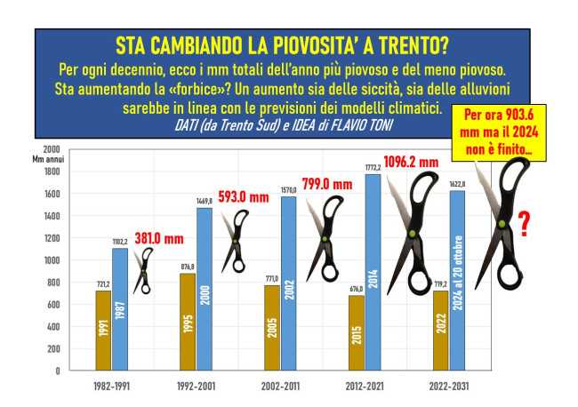 "L'estremizzazione delle precipitazioni prevista dai modelli climatici - dice Poletti - potrebbe essere già una realtà anche per noi: a Trento, nel corso dei decenni, pare stia aumentando la "forbice" di millimetri fra gli anni più secchi e quelli più bagnati. Sono dati da appassionati, non è uno studio "vero" (magari è solo una coincidenza)".