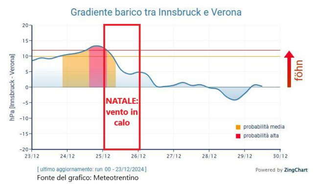 Il vento forte da nord su scala alpina è invece causato dalla differenza di pressione al suolo tra i due versanti delle Alpi. Quando il gradiente di pressione tra Innsbruck e Verona supera gli 8-10 hPa (o millibar), si innesca il vento anche nei bassi strati atmosferici, come accade oggi e nei prossimi giorni.