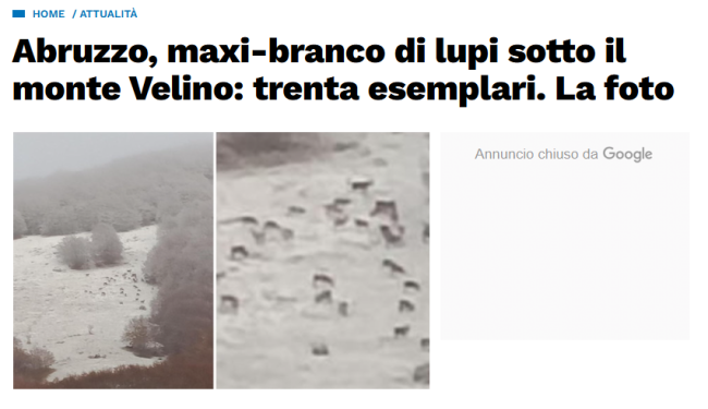 Una notizia (falsa) che il giornale Il Tempo ha prontamente ripreso e pubblicato con tanto di titolone: "Abruzzo, maxi-branco di lupi sotto il monte Velino: trenta esemplari". Il quotidiano spiega che l'avvistamento è stato fatto "nella zona di confine tra Aquilano e Reatino, dove la prima neve è scesa e i branchi di lupi si riorganizzano a quote medio elevate".