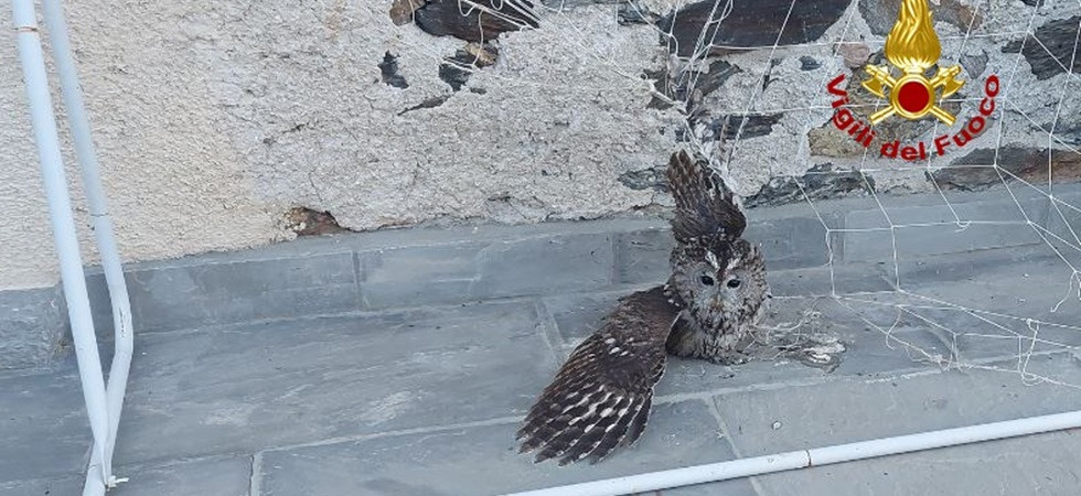 L'allocco resta impigliato nella rete di una porta da calcetto: liberato dai vigili del fuoco