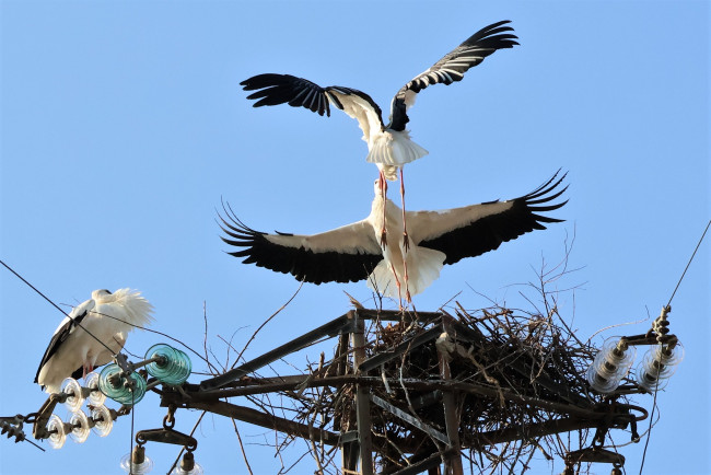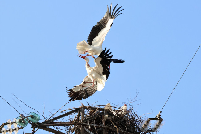 ''Lui, lei e l'altro'', il violento combattimento tra due maschi di cicogna. Le bellissime FOTO che mostrano lo scontro aereo