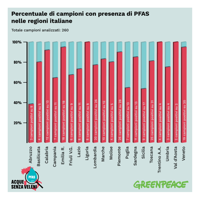 ROMA. Dal Veneto al Trentino Alto Adige, passando per la Sardegna, il Piemonte, l'Umbria, la Toscana e chi più ne ha più ne metta. Dal Nord al Sud i Pfas (sostanze poli- e per-fluoroalchiliche) sono risultati presenti nel 79% dei campioni di acqua potabile analizzati da Greenpeace Italia nell’ambito dell'indagine indipendente “Acque Senza Veleni”.