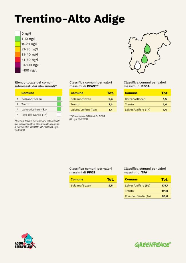 Nell’ambito delle sue analisi indipendenti, Greenpeace Italia ha inoltre verificato la presenza nelle acque potabili italiane del Tfa, la molecola del gruppo dei Pfas più diffusa sul pianeta, per cui nel nostro Paese non esistono dati pubblici. Il Tfa è una sostanza persistente e indistruttibile ancora oggetto di approfondimenti scientifici che, per le sue stesse caratteristiche, non può essere rimossa mediante i più comuni trattamenti di potabilizzazione. Il comune di Castellazzo Bormida (AL) ha mostrato i valori più elevati (539,4 nanogrammi per litro), seguito da Ferrara (375,5 nanogrammi per litro) e Novara (372,6 nanogrammi per litro). Concentrazioni molto alte si registrano anche ad Alghero (SS), Cuneo, Sassari, Torino, Cagliari, Casale Monferrato (AL) e Nuoro. La Sardegna (77% dei campioni positivi), il Trentino Alto Adige (75% dei campioni positivi) e il Piemonte (69% dei campioni positivi) sono le Regioni in cui la contaminazione da Tfa è risultata essere più diffusa.