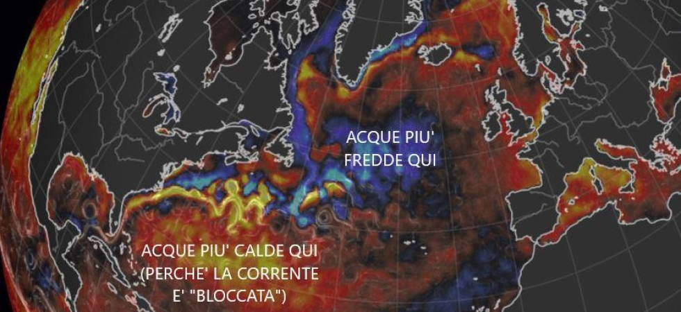 Un 'nastro' che rappresenta una parte importantissima – centrale proprio nella mitigazione del clima europeo – del più ampio sistema circolatorio dell'Amoc: “La corrente – continua Poletti – esiste perché nel Mare Artico dell'acqua affonda. L'affondamento avviene sia per il raffreddamento (l'acqua a 4 gradi centigradi ha la massima densità) sia perché il ghiacciamento della banchisa 'lascia' fuori il sale, che appesantisce l'acqua. Questo meccanismo però, vista la banchisa ai minimi e un Artico sempre più caldo, si sta inceppando. Inoltre la fusione della Groenlandia, che rilascia acqua dolce (quindi 'leggera' perché senza sale) in Atlantico, contribuisce ulteriormente a bloccare la Corrente del Golfo e a generare quel 'blob' azzurro, che è figlio del caldo”.