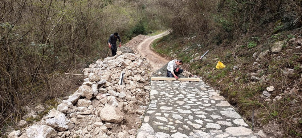 L’intervento ha previsto il rifacimento del fondo del sentiero, con la rimozione delle parti compromesse e la preparazione di una nuova base più solida. Per garantire maggiore resistenza nel tempo, è stata inoltre inserita una struttura di rinforzo e il tracciato è stato ricostruito utilizzando pietre locali, posate in modo da migliorare stabilità e aderenza.