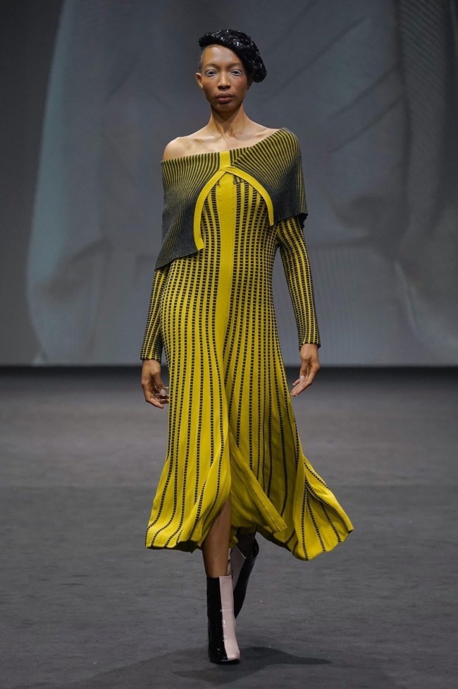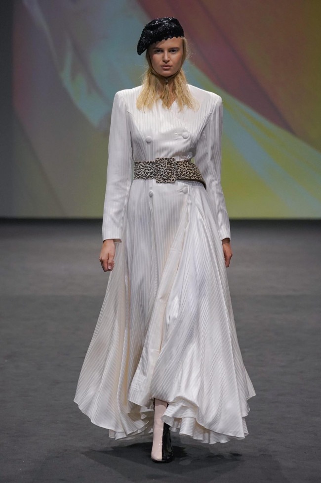 Linee essenziali, proporzioni che si fanno sobrie, severe nelle lunghezze cangianti di garza elastica, organza che si sposta dal tubino alla gonna a ruota godet, scollature squadrate. Abiti potenti che trovano il sapore della couture con l'emotività del lamé oro abbinato a panna, arricciature e balze/ruches/dettagli peplum per gilet e gonne, un bolero dalle curve sontuose.