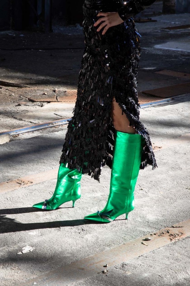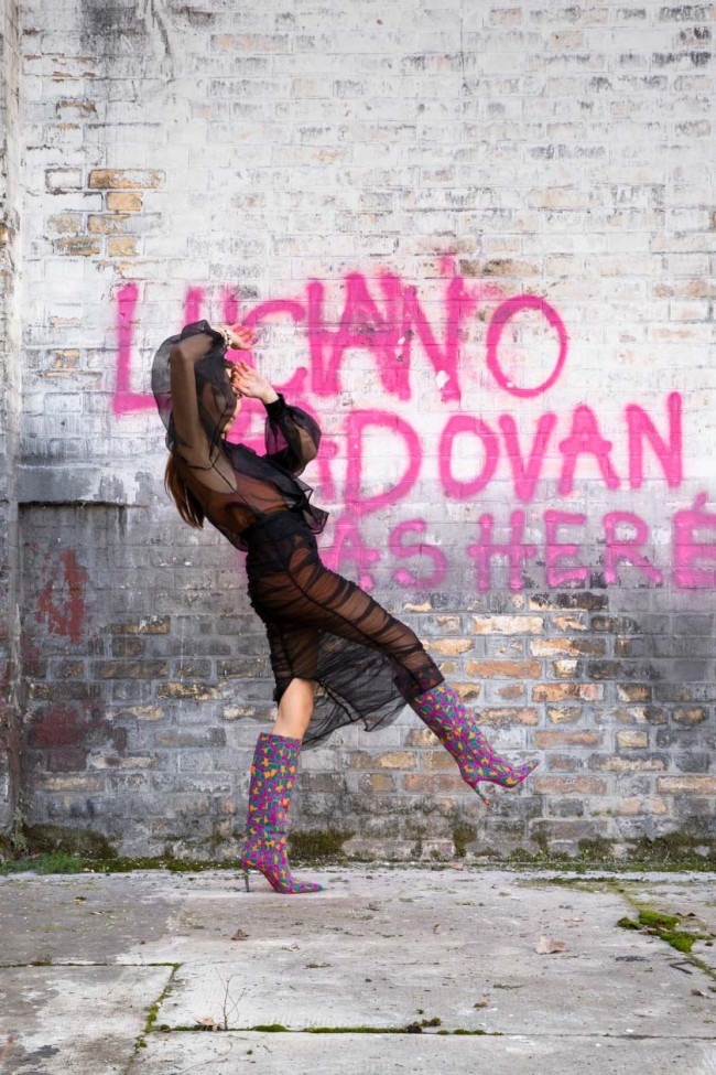 Lo stivale dalla linea slanciata e dalla punta decisa da sempre è nell’heritage di Luciano Padovan. Una serie di boots dalle originali soluzioni per materiali e colori ne rappresenta la lettura contemporanea. Il camoscio color fucsia si anima di una fantasia maculata: una stampa spotted ottenuta grazie a un effetto pennellata a rilievo, mixando colori come il dark green e l’orange. Con la termosaladatura di micro borchie viene ottenuto un sensuale effetto degradé. I tacchi sono molto alti o carrarmato per la versione da giorno.