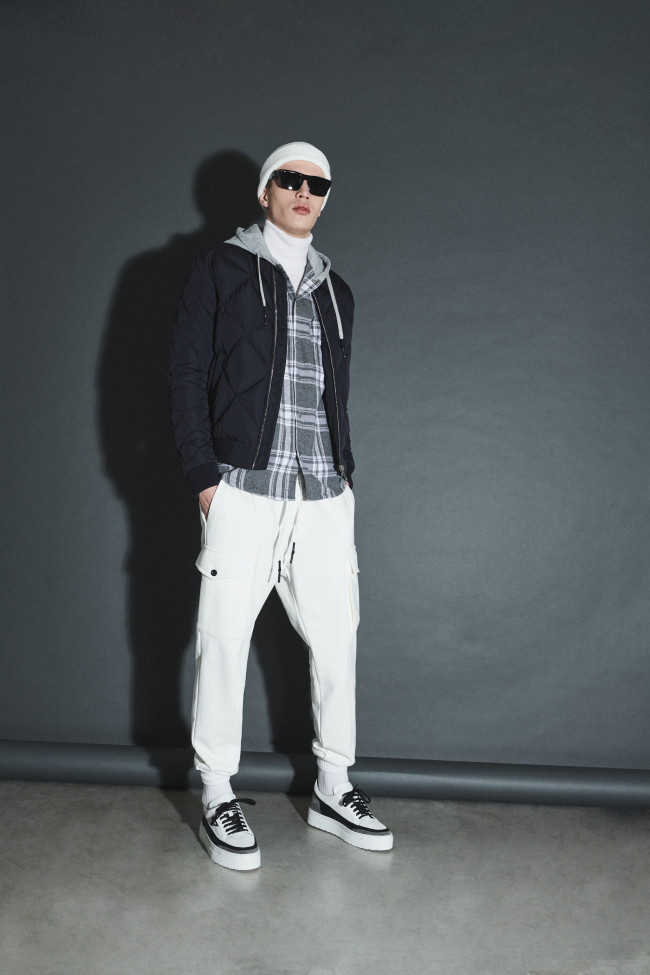 Ci spostiamo ancora più a Nord tra skyline ultramoderni e paesaggi di mare per un mood contemporaneo e pulito. La cartella colori ricorda il mare d'inverno: blu inchiostro, grigio, ghiaccio e bianco come colori chiave. Capi essenziali dai colori freddi disegnano una silhouette asciutta, portabile ed elegante. Tra i capispalla: piumini superpuffer o semplici con dettagli insoliti e contrasti di tessuti lucidi ed opachi trapuntati a righe o losanghe, capi ibridi tra giubbotto e pullover. Maglie in color block nei toni siderali, felpe e overshirt nei toni del grigio e bianco.