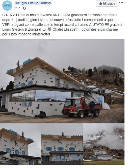 BOLZANO. Dopo il maltempo che non ha risparmiato alcun territorio, le Dolomiti un po' alla volta si stanno rialzando. E' emblematico il caso del Rifugio Emilio Comici, che si trova ai piedi del Sassolungo nel comprensorio sciistico di Plan de Gralba in Val Gardena.