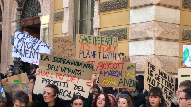 “Siamo qui per il nostro futuro” dicono anche gli studenti della quarta A del liceo linguistico Scholl. “Se gli altri non fanno nulla noi non possiamo stare fermi”. Nel corteo ci sono cartelloni di ogni tipo da quelli in cui si parla di riscaldamento globale, alla distruzione delle foreste ma anche la necessità di preservare beni fondamentali come l'acqua per arrivare poi, provocatoriamente, a chi è arrivato al corteo vestito da Donald Trump oppure anche da dinosauro con la scritta “Voi siete ancora in tempo”.