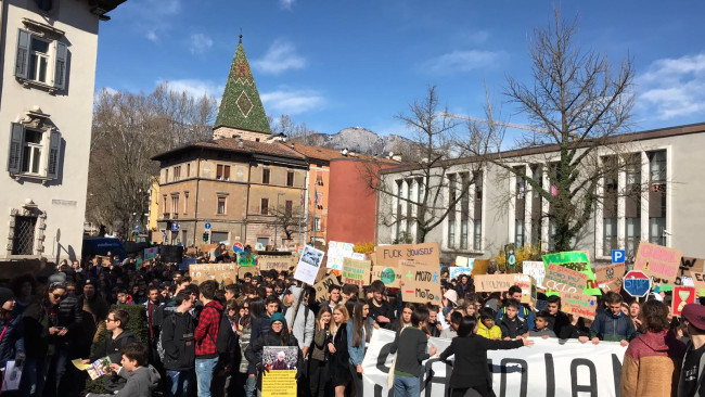 Alle 8 gli studenti già affollavano le vie del centro storico di Trento. Piazza Duomo ha iniziato a riempirsi di giovani, cartelloni e colori e alle 9 via Verdi straripava di persone al grido “E' ora di agire”.
