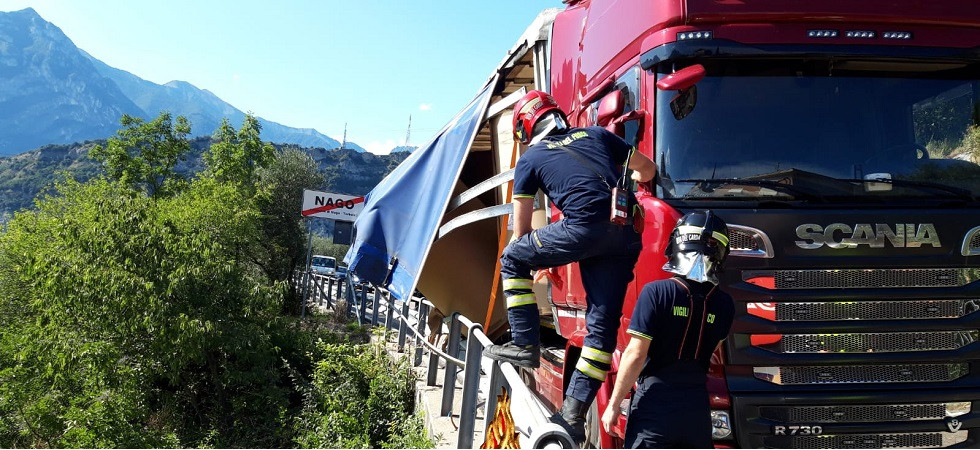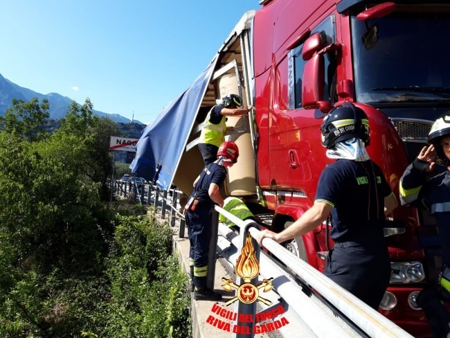 Sul posto ci sono anche i vigili del fuoco permanenti di Trento e il corpo di Riva del Garda per il recupero del carico perso lungo la strada. In azione anche l'autocarro con braccio meccanico. I pompieri hanno stabilizzato il semirimorchio, mentre l'autogru ha sollevato di peso, nonostante il carico, il mezzo pesante per la messa in sicurezza.