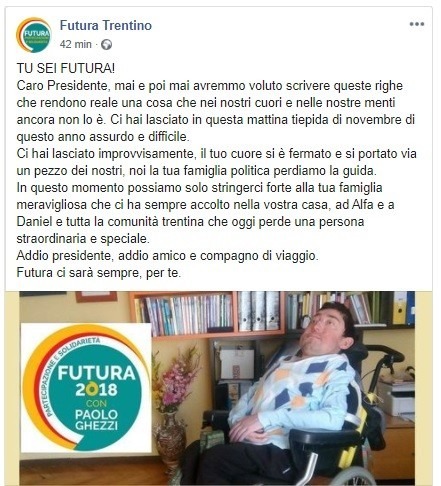 Anche Futura, il movimento di cui Piergiorgio Cattani è stato fondatore e presidente, ha deciso di salutarlo con un messaggio su Facebook. “Caro Presidente mai e poi mai avremmo voluto scrivere queste righe che rendono reale una cosa che nei nostri cuori e nelle nostre menti ancora non lo è. Ci hai lasciato in questa mattina tiepida di novembre di questo anno assurdo e difficile. Ci hai lasciato improvvisamente, il tuo cuore si è fermato e si è portato via un pezzo dei nostri, noi la tua famiglia politica perdiamo la guida. In questo momento possiamo solo stringerci forte alla tua famiglia meravigliosa che ci ha sempre accolto nella vostra casa, ad Alfa e a Daniel e tutta la comunità trentina che oggi perde una persona straordinaria e speciale. Addio presidente, addio amico e compagno di viaggio. Futura ci sarà sempre, per te”.