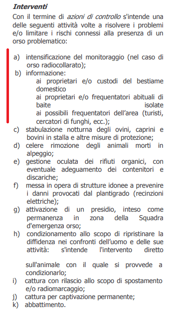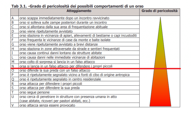 Ma è la normativa, che comunque, parla chiaro. In conferenza stampa Fugatti e Zanotelli, infatti, hanno sottolineato che con questo falso attacco si conferma la pericolosità di questo animale che andrebbe catturato. La scienza, però, non la pensa come loro. Il piano Pacobace al riguardo parla chiaro. Il grado di pericolosità in questo caso è N e il tipo di intervento previsto per N è a) o b). A cosa ci riferiamo?